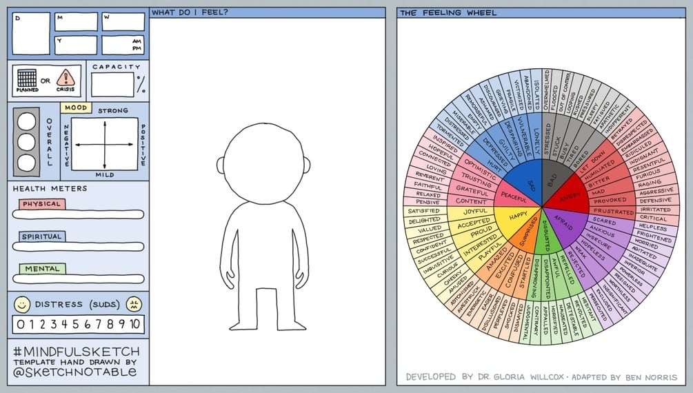 This template helps combine sketchnoting with principles of mindfulness. By using your hands, you can help focus your mind and understand yourself better.